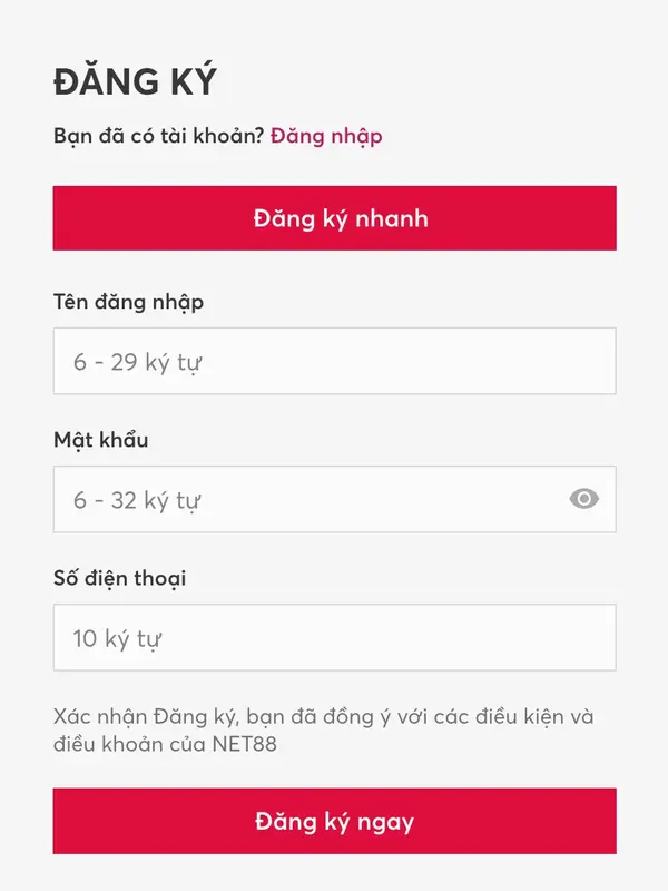 Trên giao diện chính, bạn sẽ thấy nút Đăng Ký nổi bật. Hãy nhấn vào để bắt đầu.